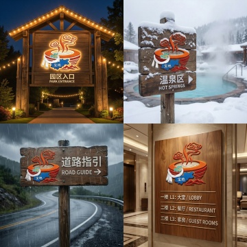 一个位于松林内的温泉泡池,泡池的外轮廓结合从龙爪的元素抽象化设计,泡池相连一个休闲平台,平台上放置有两把休闲躺椅,泡池的压顶齐平平台,泡池周边是自然的石头结合低矮的灌木,平台是龙鳞样式的压纹。温泉的进水口由烛龙元素与大块的石头结合而成,温泉水从进水口流入泡池内,温泉水从烛龙的烛台流入泡池内。烛龙是人面龙身拿着烛台的形象。泡池内禁止溢水出去,平台外是丰富的植物绿化:大乔木、小乔木以及灌木,且局部点缀
