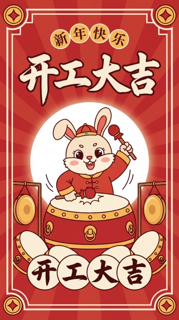 国潮风剪纸风格,卡通兔子拟人打鼓,喜庆红金配色,新年开工大吉主题,可爱感十足。
