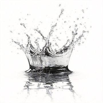 一张高清晰度的水形态创意摄影,以纯净的浅蓝色渐变背景为衬托,水面平静如镜,倒映着上方跃动的水流。画面中央,清澈透明的水从水面向上涌起,凝固成一朵优雅绽放的水晶般水花,水珠晶莹剔透,边缘泛着柔和的高光,细小的水滴如钻石般四散飞溅,悬浮在空气中,呈现出灵动而富有张力的动态瞬间,光影效果柔和自然,营造出宁静、纯净且充满生命力的氛围。