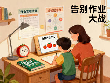3D风格小男孩,小学生形象,戴黑色眼镜,黑色短发,穿着蓝色短袖,侧面视角。小男孩坐在木质写字台前写作业,身体弓着背,头部前倾靠近作业本,姿势不正确。书桌远端放置一盏白色台灯,灯光柔和照亮桌面,书桌近端堆叠一摞彩色封面的书本,书本高度不遮挡小男孩和作业本,背景为简洁的白色墙面,整体画面干净整洁,突出人物动态和场景细节。