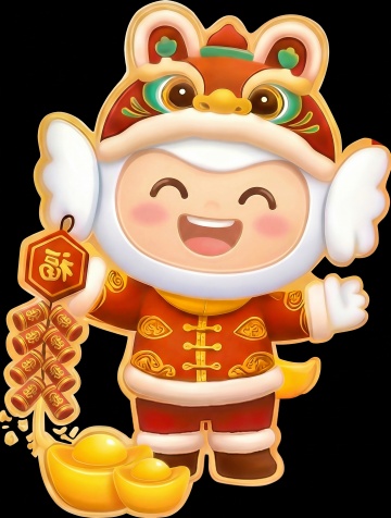 国潮风插画,拟人化小马戴狮头帽,剪纸纹样点缀,喜庆可爱,手持“发”字红包,传递新年祝福。