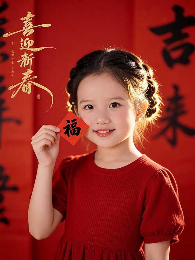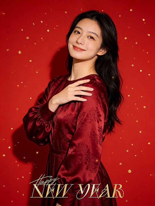参考第一张图保留人物脸型、年龄特征生成新春时尚人像写真;喜庆温暖中式风格,高饱和中国红核心色调;标准焦段50mm,F/4光圈(F/2.8-F/4区间),平视视角(人物视线与眼部齐平),人物居中(居中构图),占画面70%,人物入境范围腰部以上区域,位于画面的中心,为绝对视觉聚焦点,大师级构图;头部发型完整,头肩比例协调;参考第二张图在画面底部的中间位置叠加金色手写狂放张扬错落感横版版式书法草书字体“贺新年”(中式感红色印章落款);人物自然优雅站姿,甜美灵动气质,嘴角温柔微笑,暖调自然白细腻通透肤质,保留自然皮肤纹理;身着深黑色哑面中式小立领无袖旗袍(面料带细腻暗纹提花1.3);身体微微向左侧微微倾,双手手指轻捻精致的传统中式纹样镂空工艺非遗马造型红色剪纸(道具),近面颊下颌处,俏皮展示状;表情自然灵动;发型为简约韩式自然高束发(发髻,自然碎发)精致发型,清透哑光妆容,淡妆,肤质白皙细腻;白皙肤质,极淡裸粉哑光眼影打底,极细内眼线填充睫毛根部,大直径深棕色带细微高光点的自然款美瞳;唇妆:微微镜面水光唇釉,唇形饱满、唇峰清晰、唇面透亮光泽;直视镜头,嘴角微微上扬轻笑,自然优雅坐姿,打光:侧前柔光(左侧散射主光),面部光影过渡自然,(面部光比1:1.3),画质为高分辨率精细质感,清晰呈现缎面纹理、镂空工艺非遗马造型红色剪纸细节;滤镜为高饱和喜庆风(强化红色系浓郁度,保留肤色自然质感);背景为酒红色哑光幕布,整体氛围古典雅致喜庆感,背景全景添加鎏金金色细碎颗粒元素;高清晰度。去除人物之外的所有元素,滤镜:胶片颗粒感(ISO400)国风滤镜,氛围:温婉东方诗意。详情