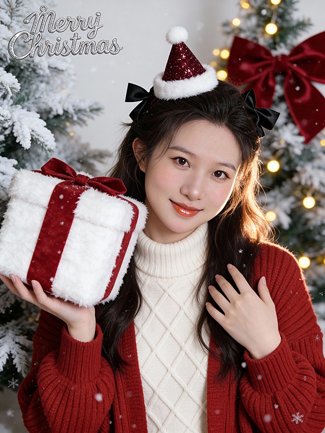 考第一张图保留人物脸型、发型、年龄特征生成圣诞主题柔和治愈系肖像写真:近景(取景范围覆盖人物头部至胸部往下5cm),居中构图,参考第二张图人物的占位和比例,人物占画面70%,平视室内场景视角(镜头高度与人物眼部平齐);50mm标准焦距,非对称均衡构图(人物偏置画面右侧黄金分割点,适度留白),人物为视觉中心;米白色粗线针织宽领落肩上衣(麦穗纹纹理,蓬松柔软质感),伪素颜清透妆(底妆轻薄保留自然肌理,浅棕眼影无眼线,自然卷翘睫毛,豆沙粉哑光唇),头部佩戴草绿色短毛绒圣诞树造型的发饰(树上点缀四颗错落分布的白色精致小圆珍珠,树顶黄色毛绒球,系白色小蝴蝶结)站姿自然随性松弛感,头微倾斜,右手举起,食指指向头顶圣诞树发饰方向,指尖舒展,浅笑注视镜头,眼神俏皮可爱,神态自然舒展,清透冷白皮甜酷精致妆容,橘红色玻璃光泽唇釉,粉桃色渐变腮红(晕染范围至眼下8mm),深棕细闪眼影+黑色上挑粗眼线+卷翘浓密睫毛,颈饰:白色丝绒质感缎带颈带蝴蝶结(带宽0.6mm,蝴蝶结尺寸2cm×2cm)漫射自然光,柔和无硬影,面部光比1:1.3,细节锐度适中(针织纹理/发丝/毛绒质感清晰可见),8K超高清分辨率,温馨感,全局饱和度+8%,叠加1mm半透明白色雪花粒子(分布密度:背景区域>人物区域),带5%胶片颗粒感(颗粒尺寸0.5px)。暗部亮度+10%,叠加“透明彩色泡泡(直径1-3cm)”,带3%细胶片颗粒感(颗粒尺寸0.3px),浅米色哑光纯色背景布,材质无反光、表面平整,无多余纹理,前景白色喷雪仿真松枝圣诞树点缀,严格按照第一张图内容生成。详情