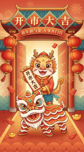 国潮风插画,拟人化龙娃手持“开市大吉”卷轴,舞狮欢腾,剪纸元素点缀,红金配色尽显喜庆感与节日氛围。