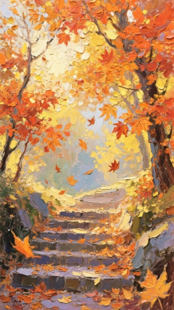 秋日林间小径,金黄落叶铺满蜿蜒路途,厚涂笔触营造朦胧柔和氛围,印象画派风格演绎静谧唯美的文艺秋景。
