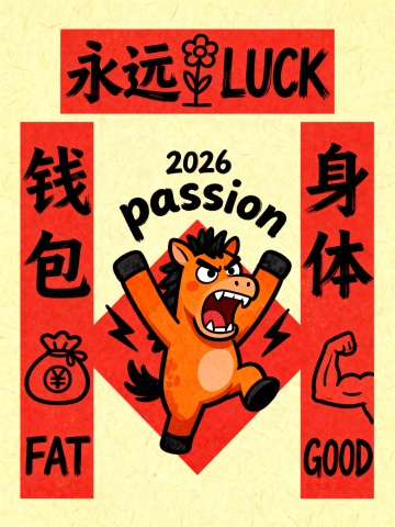 中式感与国潮风融合,双色设计凸显喜庆,大字风“财运加马”以版画风呈现,印刷质感浓厚,寓意吉祥如意,尽显传统节日氛围。