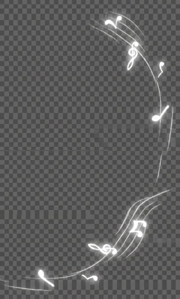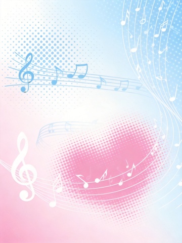 浅蓝色背景上,由白色发光的五线谱曲线和多种音乐符号(高音谱号、八分音符、四分音符、升号)组成的优雅音乐元素图案,符号呈现柔和的半透明发光效果,曲线流畅自然地在画面中形成环绕式布局,整体保持简约现代的设计风格,营造出宁静而富有韵律感的氛围。