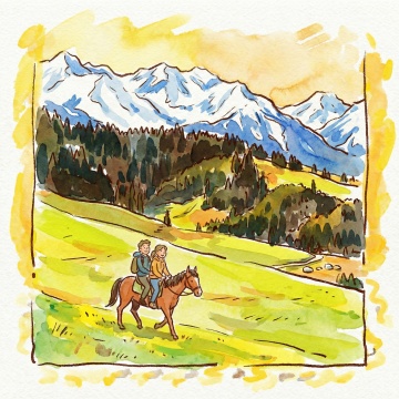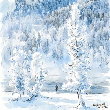水彩风插画,雪域湖畔静谧唯美,秋林与雪山映衬梦幻清新,鹿影相伴,二人悠行,尽显冬日文艺诗意。