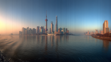 上海陆家嘴天际线全景,以东方明珠电视塔为视觉中心,周围环绕着现代化高楼大厦,黄昏时分,天空呈现从深蓝到粉紫渐变的绚丽色彩,云彩被染成柔和的粉紫色,城市建筑灯火初上,部分楼宇亮着黄色暖光,平静的水面倒映着整个城市景观,形成完美对称的镜像效果,水面如镜面般光滑,反射出天空和建筑的色彩与细节,整体氛围宁静而壮丽,具有高度写实的摄影质感,清晰的细节,高对比度,柔和的光线,专业的城市风光摄影风格。