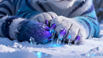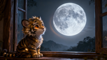 鎏金白虎腾跃于虚拟自然,3D光影交织,粒子流光环绕,神圣威严中透出梦幻奢华,视觉冲击力十足。