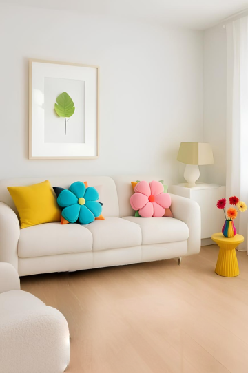 3D渲染风格的现代简约客厅,从不同角度展现的室内场景,柔和明亮的自然光从大窗户洒入,形成温暖的光影效果和清晰的阴影细节,浅色木地板搭配米白色地毯,宽敞的浅灰色L型沙发上摆放着白色和浅蓝色靠垫,沙发前是浅色木质茶几,上面有简约的装饰品,背景墙为纯净的白色,一侧有木质置物架摆放着小型装饰画和绿植,另一侧是大型绿色植物增添生机,整体采用清新淡雅的配色方案,房间内的家具摆设布局经过精心设计,呈现出舒适、整洁、通透的居住氛围,具有高级的空间感和设计感。