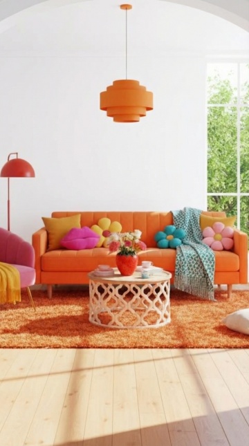 极简主义风格室内设计,以米白色和浅木色为主色调,柔和的自然光从左侧窗户透过轻薄纱帘洒入,形成温暖的光影效果。画面中央是一个浅米色的L型布艺沙发,搭配三个橙色靠垫和两个米白色靠垫,沙发前是一张浅木色的椭圆形茶几,茶几上摆放着一个橙色陶瓷花瓶,里面插着白色和浅绿色的植物枝条,旁边还有一个小型编织篮。地面铺着浅灰色地毯,整体空间线条简洁流畅,具有现代简约的设计感,营造出宁静、舒适、明亮的居家氛围。