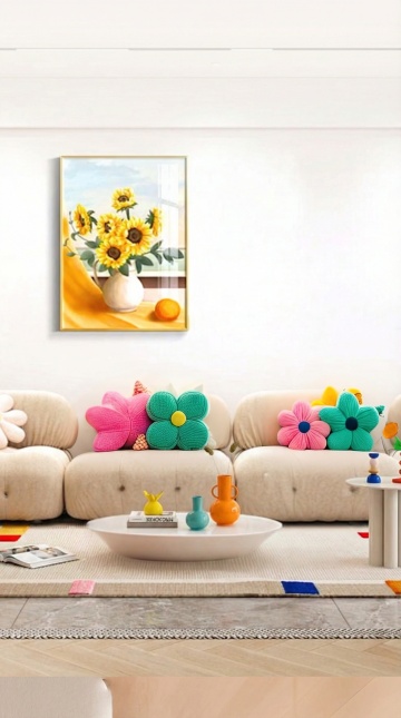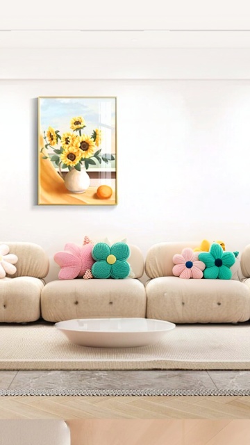 温暖柔和的奶油风客厅,米白色布艺沙发搭配多个浅色抱枕,沙发前铺有浅米色地毯,木质地板自然舒适。沙发背景墙为米黄色,墙上挂着一幅带有棕色相框的风景画,画中是柔和的海景。沙发上方的置物架上摆放着一盆绿植、一个几何纹路陶罐、一个复古黄铜座钟和一盏黑色金属台灯,置物架左侧矮台上有一个粉色陶瓷花瓶,旁边的小桌上放着几本翻开的杂志。整体采用低饱和度的暖色调,光线柔和,通过侧光营造出温馨静谧的氛围,光影层次丰富,具有简约而不失格调的日式侘寂风美感,空间布局通透,物品摆放错落有致,充满生活气息。
