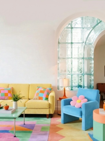 极简主义风格室内场景,明亮通透的空间,以米白色和浅卡其色为主色调,柔和的自然光从拱形窗户洒入,在墙面投下清晰的光影纹路,浅米色布艺沙发搭配绿色和橙色抱枕,地面铺有浅绿色地毯,角落摆放一盆绿植,墙面装饰有竖条纹肌理设计,整体呈现出简约、舒适、温暖的居家氛围,空间布局开阔,线条流畅,材质质感细腻,光影层次丰富。