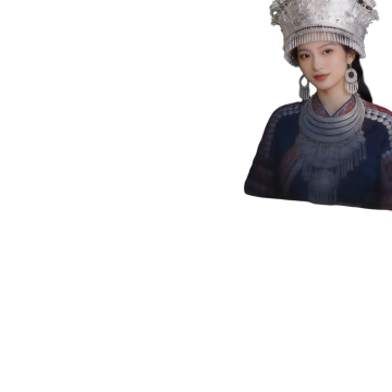 设计一个苗族小女孩的IP形象,穿着苗族传统服饰,为方襟大袖摆样式,具有浓郁民族特色,整体造型富有层次感服饰为蓝色,姿态活泼 ,头戴银冠造型华丽,上面布满精致花纹和装饰,边缘悬挂着银质流苏、银项圈多层佩戴,大小不一,长发垂于身后