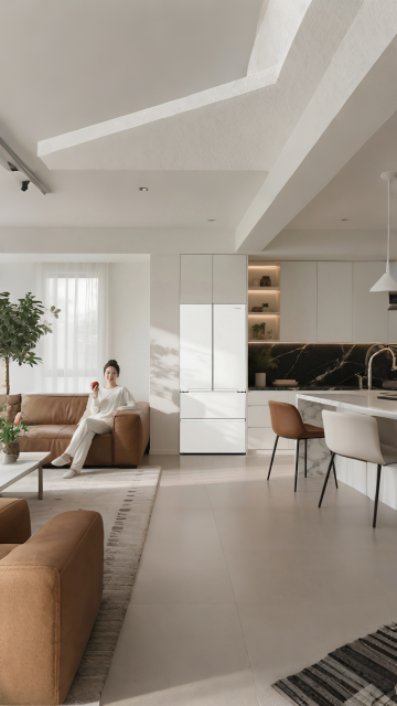 极简主义风格室内场景,柔和的米白色墙壁,自然光透过木质百叶窗和米色垂坠窗帘洒入,浅灰色木地板上铺着带有细腻波浪纹理的浅色地毯。房间中央是一张造型圆润、线条流畅的白色羊羔绒单人沙发,搭配一个橄榄绿色的方形靠垫。沙发旁是一个白色圆柱形边桌,桌面上摆放着一本翻开的书和一个插有细枝绿植的透明玻璃花瓶。沙发后方墙上悬挂着一幅现代抽象画,画作以棕色、米色、白色和橙色的大胆笔触构成,带有明显的颜料肌理感。右侧是嵌入式浅木色置物架,其中一层放置着一个透明玻璃花瓶,里面插有绿色植物。整体色调温暖柔和,光影层次丰富,营造出宁静、舒适、简约而不失格调的居住氛围,空间布局通透,细节处理精致,具有现代简约的高级设计感。