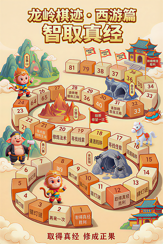 西游记元素背景,主题名称为"龙岭棋迹 西游篇:智取真经",画面符合西游记主题,中间部分留白以便后期添加活动详细内容详情