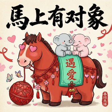 国潮插画风,拟人化小象骑马,融合剪纸与水墨元素,喜庆可爱,寓意“马上有对象”,传递浪漫祝福。