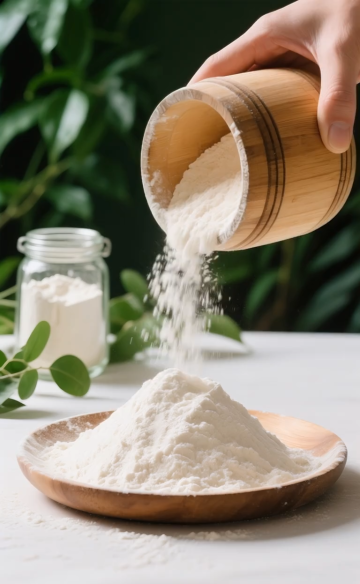 清新自然光下,木雕风容器倾泻面粉,轻拟物质感融合实景感,质朴中透出柔和舒适,传递生活本真之美。