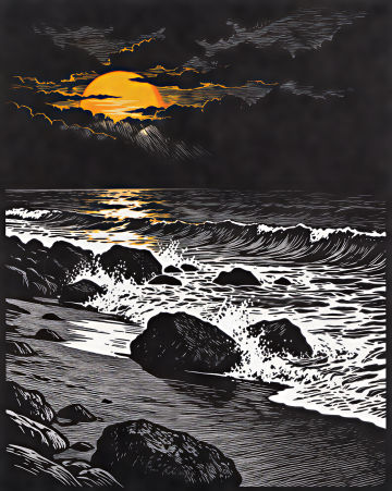 一幅印象派风格的海景画作,画面中央是一块半浸在水中的深色岩石,海水撞击岩石溅起白色的水花,阳光透过云层洒在海面上,形成金色的光斑和波光粼粼的效果,整体色调以温暖的橙黄色和金色为主,天空呈现出柔和的粉紫色渐变,营造出浪漫而富有诗意的氛围,笔触厚重而富有肌理感,色彩的运用大胆而奔放,光影交错间展现出印象派特有的光影变幻和色彩韵律。