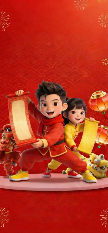 软3D国潮风,卡通角色手持“福”字春联,红灯笼映衬古街,喜庆中式年味十足。
