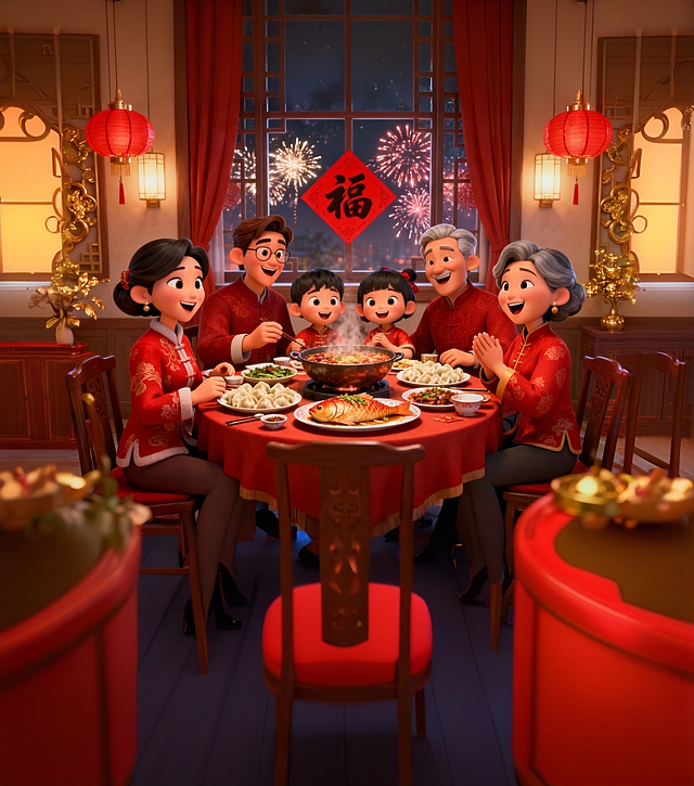 3D 卡通风格,迪士尼萌系渲染,国风新年主题。主体:Q 版可爱小男孩,身着红色中式新年服饰、头戴虎头帽,笑容灿烂坐在中式古建筑屋顶,身旁依偎两只红棕色卡通小马玩偶(马年元素),仰头望向夜空。场景:夜晚的中式古镇,飞檐翘角的传统古建筑群,渐变蓝紫色夜空,空中飘满红色孔明灯,绽放金色、红色的绚烂烟花。色彩:主色调为红色(服饰、灯笼、建筑装饰)、金色(烟花、装饰细节),搭配蓝紫色夜空,暖冷对比鲜明,营造喜庆热烈的新年氛围。构图:低角度仰视视角,主体居中,上半部分为烟花夜空,下半部分为古建筑,层次分明。细节:建筑悬挂红色春联(新年吉祥语)、中式灯笼,烟花动态绽放,孔明灯暖光点缀,小马佩戴金色项圈,男孩服饰有传统纹样。元素位置:男孩与小马在画面中下部屋顶中央,烟花分布在上部夜空,孔明灯散落在画面左右及上方,古建筑群分布于画面两侧及下方。详情