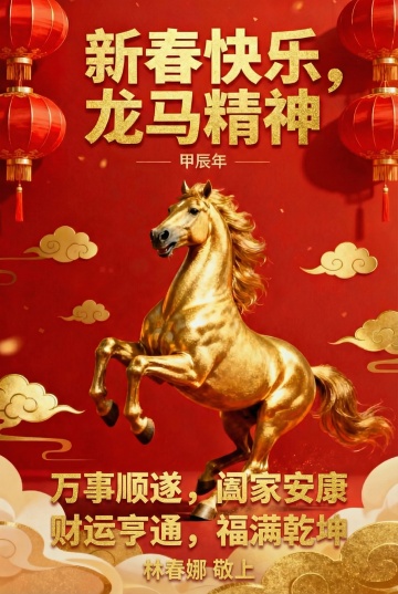 国潮风插画,厚涂油画质感,红马奔腾于祥云间,配以鎏金书法与灯笼鞭炮,尽显新春喜庆与中式古典韵味。