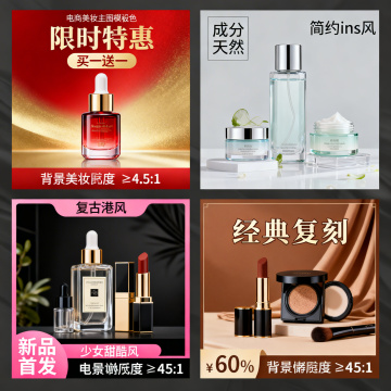 奢华感与现代感交织,融合鎏金风、玻璃风与极简主义,突出促销感与质感,光影交错间展现美妆的时尚魅力与复古韵味。