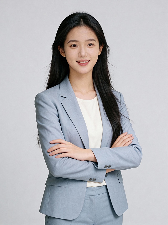 参考图中保留人物脸型、发型、年龄等特征生成职场形象照,保持人物不变,更换为深卡其色精纺羊毛混纺西装外套,西裤同色,更换全新不同手势和姿势,调整手指位置,保留耳环,简约微微暖调浅灰色纯色背景,画质超高分辨率、细节清晰,现代精致感风格;肤质精细化处理;眼神直视镜头,目光坚定且澄澈,表情自然,嘴角上扬;肤色均匀,柔光美白细腻陶瓷肌肤,哑光肤质,肤色均匀提亮;杰作,最佳画质,超高细节,写实摄影,中近景人像,皮肤细腻通透,白皙清透皮肤,柔光,正面补光,画面干净清新,高清皮肤细节;面部光比1:1.5,4800K中性光,微微修饰脸型,肤质哑光细腻,面部雾面柔光,轻透裸肌感,真实毛孔纹理;分辨率4K,严格保留原人物特征详情