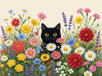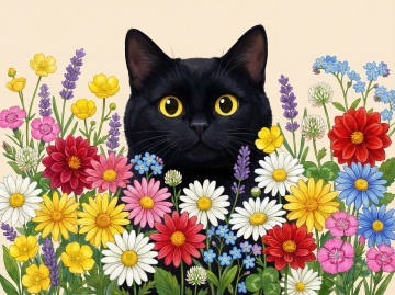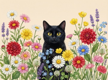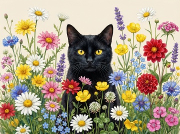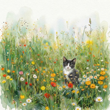 梦幻水彩插画,黑猫静坐湖心,虚拟自然美景环绕,色彩斑斓如梦。