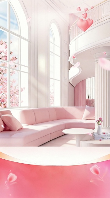 梦幻3D风,虚拟自然场景,甜美浪漫的樱花窗前,花瓣飘落,营造温馨氛围。