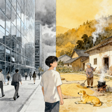 清新治愈的田园插画,融合水彩与厚涂技法,柔和梦幻的色彩渲染出春日乡野的宁静与生机,远山如黛,村落点缀其间,宛如印象画派笔下的诗意画卷。