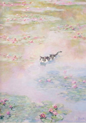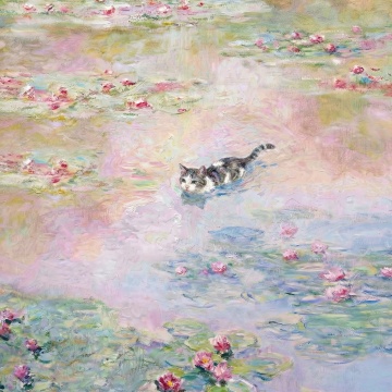 厚涂风油画质感,猫咪踏水前行,梦幻光影交织,清新唯美的自然诗意。