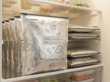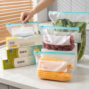 将冷冻保鲜袋放在整洁的料理台,袋子里装着刚烘焙好的曲奇饼干,旁边放着烘焙工具,暖光氛围,突出产品密封防潮保鲜功能