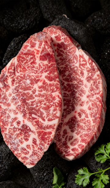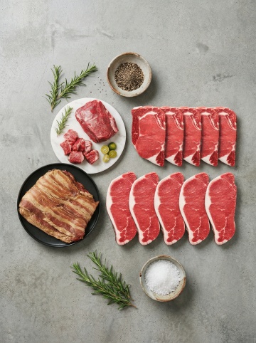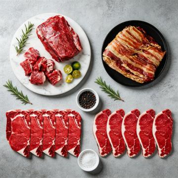 两块纹理清晰、色泽鲜红的生牛排,表面分布着白色脂肪纹理,置于铺有粗麻布的古朴木质餐桌上,周围散落着新鲜迷迭香、八角、红辣椒和黑胡椒粒,一小碗混合香料置于牛排旁,背景为暖色调的乡村厨房环境,光线柔和,突出食材的新鲜质感,整体氛围温馨自然,具有浓郁的美食摄影风格,高分辨率,细节丰富,色彩饱满。