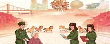 党建主题插画,金色剪影人物群像,左侧人物高举飘扬的黄色旗帜,右侧人物手持步枪,整体姿态昂扬向上,红色渐变波浪形背景从底部向右上方延伸,白色背景点缀金色颗粒质感,光影柔和,氛围庄重而充满力量,扁平化设计风格,简洁有力的视觉语言,突出革命精神与团结奋进的主题。