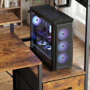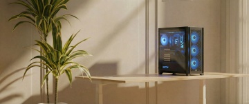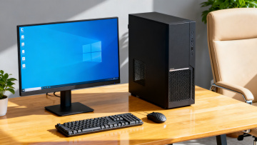 电脑产品展示图,3D渲染风格,黑色台式电脑主机、黑色显示器和黑色键盘组成的电脑套装,主机正面有品牌标识和散热孔设计,显示器屏幕亮着彩色桌面背景,整体布局为主机在左侧,显示器在右侧偏上位置,键盘在显示器前方偏右,物体边缘清晰锐利,表面光滑有轻微反光,光线均匀柔和来自上方,白色纯净背景,高清晰度,产品展示角度略微俯视,突出电脑套装的现代感和科技感。
