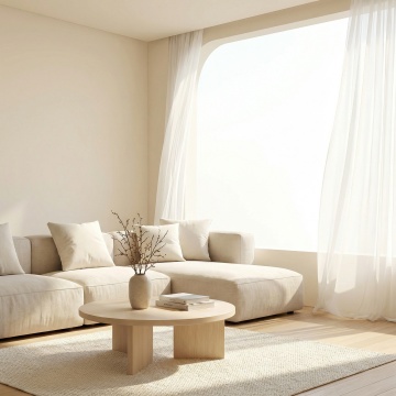 3D渲染风格室内场景,整体采用极简主义设计,主色调为纯净的米白色与柔和的浅米色,搭配低饱和度的绿色地毯和橄榄绿、暖橙色靠垫形成和谐的色彩层次。明亮的自然光从拱形窗户洒入,在墙面和地面形成清晰的光影交错效果,营造出温暖、宁静而通透的氛围。画面中包含一个米白色的模块化沙发,沙发上放置着不同颜色和材质的靠垫,沙发旁有一盆绿色植物增添生机。墙面设计简洁,一侧有垂直条纹装饰元素,地面铺设浅色木地板,整体构图遵循对称美学与三分法原则,空间感开阔,细节质感细腻,光线柔和自然,呈现出舒适、简约而富有设计感的居住环境。