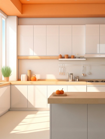 极简风格厨房设计,自然光透过窗户形成温暖柔和的光影效果,浅米色墙面搭配原木色台面与搁板,白色橱柜带有简约的圆形把手,搁板上摆放着白色陶瓷罐、木质容器和白色马克杯,台面上立着两块不同尺寸的浅木色砧板,左侧有一个装有木质餐具的白色小罐,整体色调以原木色和白色为主,营造出干净、明亮、温馨且充满生活气息的北欧风厨房空间,细节清晰,质感细腻,构图平衡,光线层次丰富。