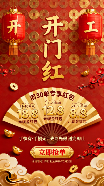 国潮风融合鎏金浮雕字,红金配色彰显喜庆奢华,大字风突出“开门红”主题,结合灯笼与祥云元素,营造浓厚中式新春氛围。