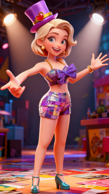 软3D风卡通少女DJ,潮流服饰搭配霓虹灯背景,展现派对的活力与时尚。