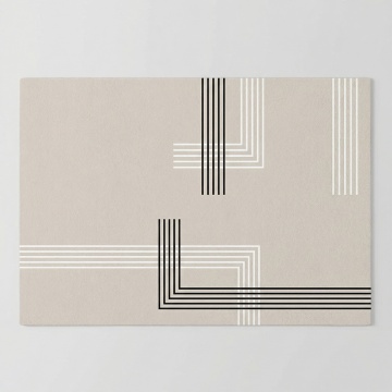 现代极简风格的客厅场景,以浅灰色调为主的现代家具布置,画面聚焦于铺在浅灰色瓷砖地面上的浅灰色条纹地毯特写,地毯表面有细腻的竖条纹纹理和柔软的编织质感,占据画面下方大部分区域;背景中可见浅灰色布艺沙发,搭配几个同色系的靠垫,沙发旁有一个圆形金属边框的小茶几,靠墙处有一个简约的灰色搁板,上面放置一个小型装饰画框;右侧是大面积的落地窗,透过轻薄的白色纱帘洒入明亮柔和的自然光,光线在地毯和地面上形成自然的光影过渡,窗外可见模糊的绿色植物,整体营造出宁静、整洁、高级的现代家居氛围,空间感开阔,线条简洁,色彩统一和谐,具有清晰的视觉层次和舒适的居住感。