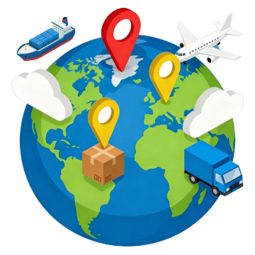 等距视角风格的物流仓库场景插画,蓝色平顶仓库建筑带有灰色屋顶和橙色大门,旁边停放着橙色集装箱卡车,地面上有多个棕色纸箱和橙色、红色集装箱,几名穿着绿色背心的工人正在搬运货物,场景中包含叉车等物流设备,整体采用明亮的蓝、橙、棕配色方案,线条简洁明快,具有清晰的等距投影效果和扁平化设计风格,无文字信息。