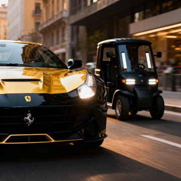 双色设计风融合金属与鎏金质感,现代科技感与奢华商务气质交织,光影交错中展现重拟物风的极致细节,酷炫实景感尽显高端汽车美学。