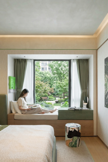 极简主义风格室内场景,柔和的米白色墙壁,自然光透过木质百叶窗和米色垂坠窗帘洒入,浅灰色木地板上铺着带有细腻波浪纹理的浅色地毯。房间中央是一张造型圆润、线条流畅的白色羊羔绒单人沙发,搭配一个橄榄绿色的方形靠垫。沙发旁是一个白色圆柱形边桌,桌面上摆放着一本翻开的书和一个插有细枝绿植的透明玻璃花瓶。沙发后方墙上悬挂着一幅现代抽象画,画作以棕色、米色、白色和橙色的大胆笔触构成,带有明显的颜料肌理感。右侧是嵌入式浅木色置物架,其中一层放置着一个透明玻璃花瓶,里面插有绿色植物。整体色调温暖柔和,光影层次丰富,营造出宁静、舒适、简约而不失格调的居住氛围,空间布局通透,细节处理精致,具有现代简约的高级设计感。