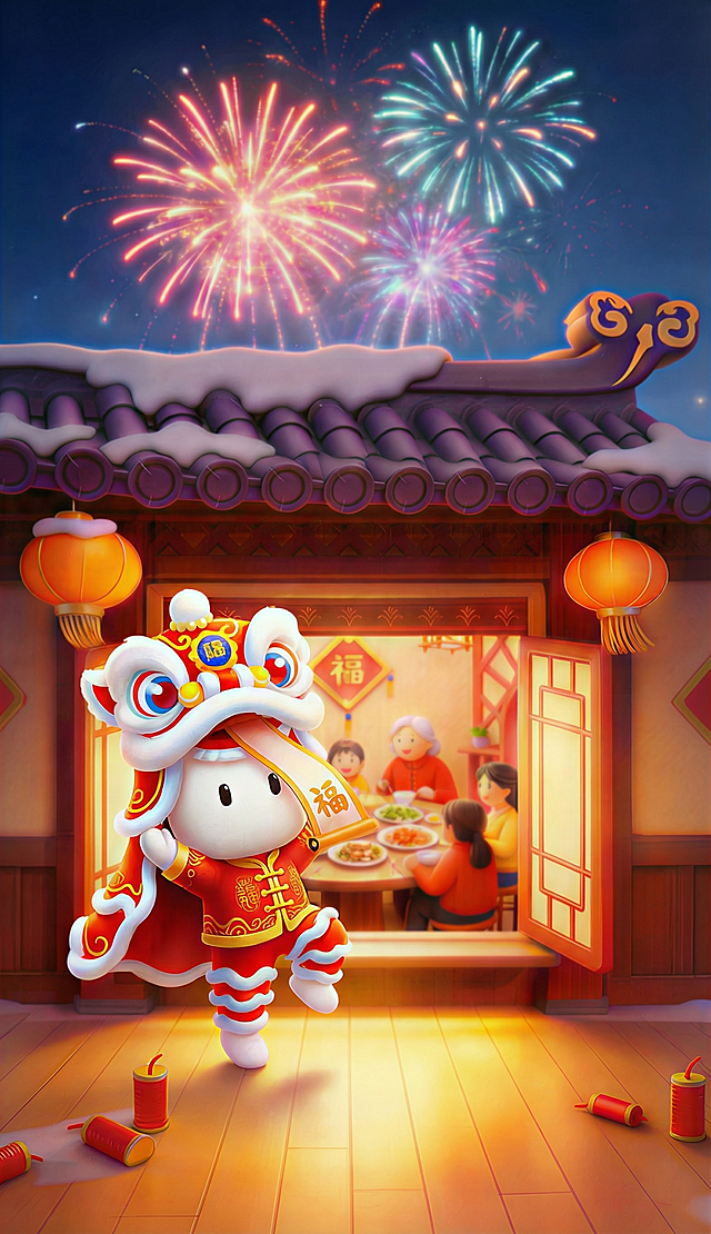 3D 卡通风格,迪士尼萌系渲染,国风新年主题。主体:Q 版可爱小男孩,身着红色中式新年服饰、头戴虎头帽,笑容灿烂坐在中式古建筑屋顶,身旁依偎两只红棕色卡通小马玩偶(马年元素),仰头望向夜空。场景:夜晚的中式古镇,飞檐翘角的传统古建筑群,渐变蓝紫色夜空,空中飘满红色孔明灯,绽放金色、红色的绚烂烟花。色彩:主色调为红色(服饰、灯笼、建筑装饰)、金色(烟花、装饰细节),搭配蓝紫色夜空,暖冷对比鲜明,营造喜庆热烈的新年氛围。构图:低角度仰视视角,主体居中,上半部分为烟花夜空,下半部分为古建筑,层次分明。细节:建筑悬挂红色春联(新年吉祥语)、中式灯笼,烟花动态绽放,孔明灯暖光点缀,小马佩戴金色项圈,男孩服饰有传统纹样。元素位置:男孩与小马在画面中下部屋顶中央,烟花分布在上部夜空,孔明灯散落在画面左右及上方,古建筑群分布于画面两侧及下方。详情