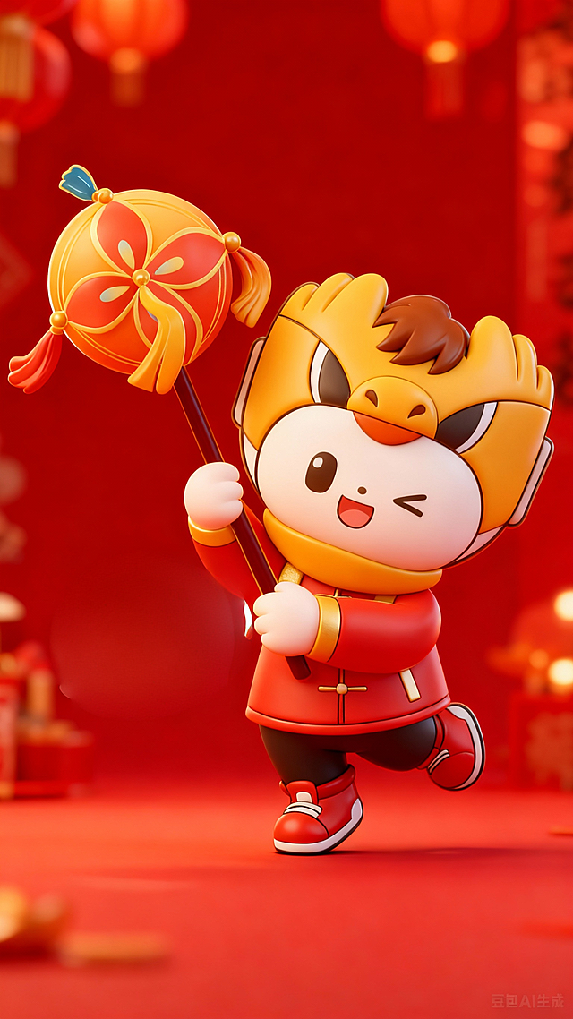 2026丙午马年竖版新年海报,3D卡通黏土质感风格,商业级电商海报画质,高分辨率8K,超精细细节渲染,画面无噪点、无锯齿,光影柔和通透,整体氛围喜庆萌趣、年味浓郁。整体色调与背景:主色调为正红+鎏金渐变,背景从上至下由深邃的正红过渡到柔和的暖橙红,背景中漂浮着半透明的浅红色云雾纹理,层次感丰富;画面顶部与右上角绽放着多组金色烟花,烟花呈放射状,有清晰的火星粒子与光尾效果,光影柔和不刺眼;空中悬浮着多枚金色铜钱(方孔圆钱样式,边缘有浮雕纹路),铜钱呈旋转飘落状,分布错落有致。主体核心(萌系小马IP):画面视觉中心是一只超萌的3D卡通小马形象,体型圆润可爱,头部比例稍大,符合Q版黄金比例;小马毛发为浅棕色与白色渐变,脸部与腹部为纯白色,脸颊有两团粉嫩的红晕,眼睛为超大号黑色圆形,眼白占比少,瞳孔有高光点,眼神灵动,嘴巴呈微笑状,露出粉色舌头,表情开心喜庆;小马头戴一顶红金配色的传统醒狮头套,头套有白色绒毛镶边,狮眼为彩色(青、黄、红渐变),狮鼻为红色绒球,头套两侧有红色流苏吊坠,流苏自然垂坠;小马身穿红底金纹的中式唐装,唐装领口、袖口有白色绒毛镶边,衣身绣有金色祥云纹与“福”字暗纹,唐装纽扣为金色盘扣,细节精致。主体动作与手持物:小马呈站立姿态,双腿分开站稳,双手(前蹄)捧着一张红色的菱形“福”字贴,“福”字为金色书法字体,字体饱满有力,福字贴边缘有金色描边,小马的手指(蹄子)呈圆润的卡通造型,贴合福字贴的边缘,动作自然。周边装饰元素(精准位置+细节质感): 1. 小马左侧(画面视角):放置一个红色的绒布福袋,福袋上绣有金色“福”字与祥云纹,袋口束紧,露出满满一袋的金色金元宝,金元宝有金属光泽与反光效果,福袋旁散落着几枚小金元宝与红色的小鞭炮(鞭炮有金色引线)。 2. 小马右侧(画面视角):摆放一个大号的金色金元宝(呈船型,表面有浮雕纹路与高光反射),金元宝旁立着一个红色的小灯笼,灯笼有金色流苏与骨架,灯笼表面有金色祥云纹,灯笼旁斜放着一把红金配色的折扇,折扇扇面为红色,扇骨为金色,扇面展开呈弧形。 3. 画面底部:铺满红色的光滑台面,台面上有清晰的倒影效果,倒映出小马、金元宝、福袋的轮廓,台面上散落着多枚大小不一的金元宝与铜钱,增强画面的层次感与富足感。 光影与质感表现:整体采用柔光打光,主光源来自画面前方,辅光源来自顶部,在小马的毛发、醒狮头套的绒毛、金元宝的金属表面形成柔和的高光与阴影;黏土质感表现为表面细腻的磨砂感,绒毛质感蓬松柔软,金属元素(金元宝、铜钱、狮头装饰)有强烈的金属光泽与镜面反射效果,布料(唐装、福袋)有柔软的褶皱与纹理质感;烟花与铜钱的光影为半透明的光晕效果,营造出梦幻的节日氛围。 画面构图与氛围:竖版中心构图,小马位于画面正中央,周边装饰元素对称分布,平衡画面;整体氛围萌趣可爱、喜庆热烈,融合传统春节元素(醒狮、福字、金元宝、灯笼)与现代3D卡通风格,精准戳中年轻群体审美,寓意马年福气满满、招财进宝、萌气十足。详情