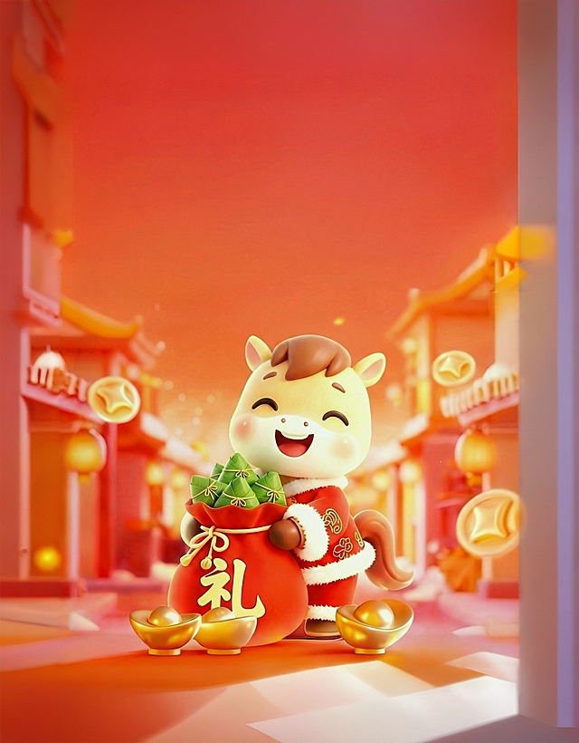 3D卡通马身着国潮红衣,手持红包与福袋,拟人化设计萌趣十足,融合鎏金浮雕元素,喜庆氛围浓郁,传递春节双至的吉祥祝福。详情
