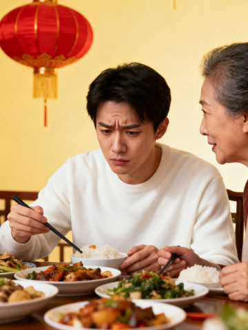 国潮风与重拟物结合,中式庭院实景中,全家围坐圆桌共庆新春,红金刺绣服饰映衬喜庆氛围,油画质感呈现温暖团圆时刻。