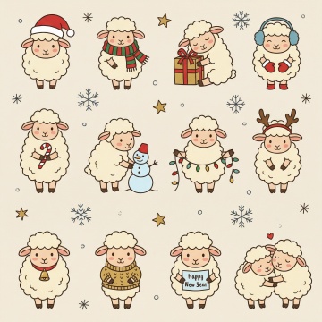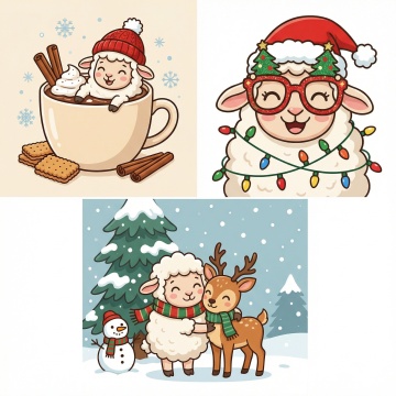 软3D风卡通小羊围炉织毛毯,拟人化萌趣互动,暖光灯下雪夜温馨感十足,面料纹理细腻,毛发生长自然,圣诞节日氛围浓厚。